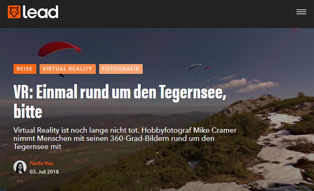 Lead, ein Online und Print Magazin vom Werben & Verkaufen Verlag, hat heute einen Artikel über Tegersee360.de veröffentlicht. Dort wurde Tegernsee360.de als Use Case für die Panono Kamera dargestellt und die Potentiale von Virtual Reality dargestellt. Panono ist die ideale Kamera für hochauflösende professionelle 360° Bilder. Die Bilder bieten genügend Spielraum für VR Anwendungen.