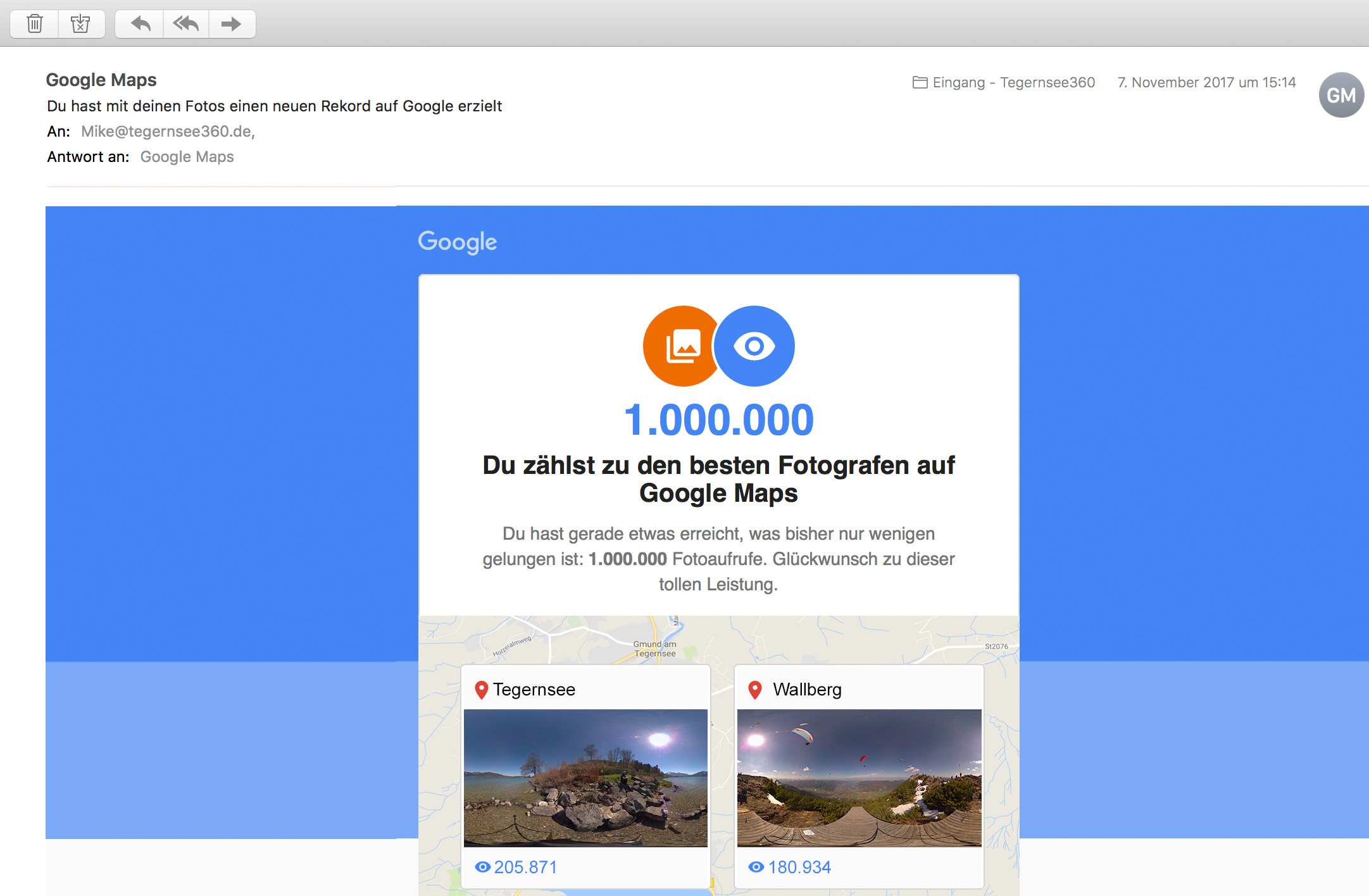 Letzte Woche erreichte uns diese freudige Mail von Google Maps. Mehr als eine Millionen Views auf Google Maps haben unsere 360 Grad Bilder vom Tegernsee und Umgebung bereits. Einige der 360 Grad Panoramen laden wir regelmässig bei Google Maps hoch und dort werden sie anscheinend fleißig angeschaut. Das erste Bild wurd am 21. Mai hochgeladen. Danach sind viele weitere gefolgt. Wir freuen uns auf die zweite Million :)